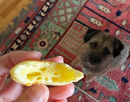 「チーズ味のパン」となると、目がないチューイ。ピーピー鼻を鳴らしながら、しまいには立ち上がってミーアキャットのように横歩きしていた。笑