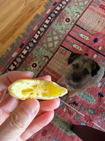 「チーズ味のパン」となると、目がないチューイ。ピーピー鼻を鳴らしながら、しまいには立ち上がってミーアキャットのように横歩きしていた。笑