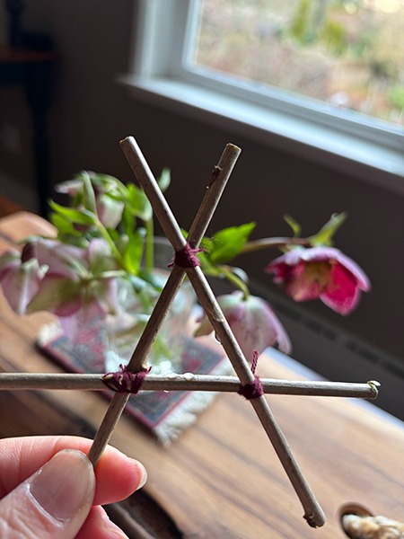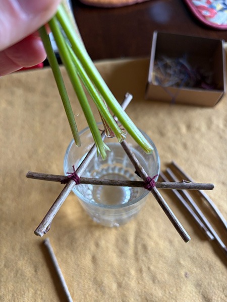 でも、ちょうどよい小さくて口の狭い花瓶がなくて。小さなコップにいれると、でろ〜んと広がって倒れる。クリスマスローズを生けるのに、花瓶の内側に「ワイヤーネット」をドームのように突っ込む、というのを見たことがある。ワイヤーを使いたくなかったので。。。
