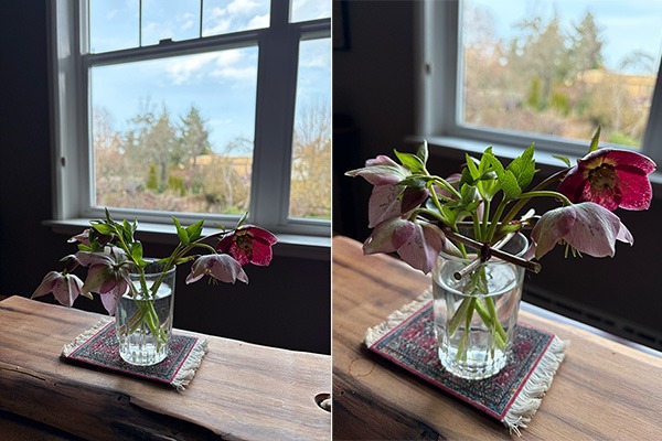 クリスマスローズは茎の部分の下から数センチ、すぅーっとカッターなどで縦に切込みを入れると、切り花にしても「もつ」ってどこかで読んだのでやってみた。