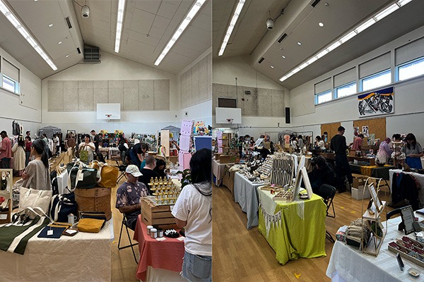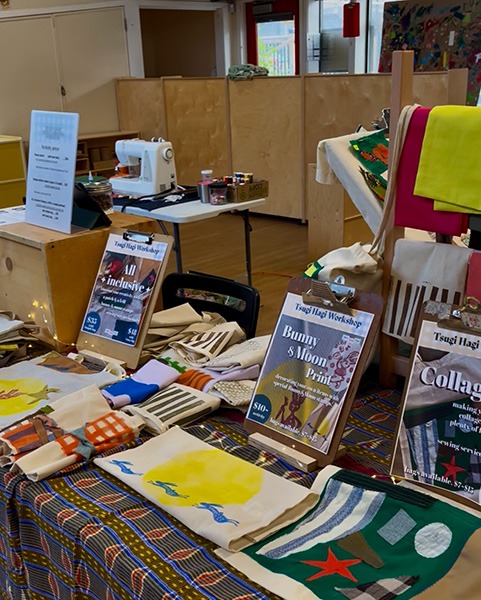 春に参加した「イチゴマーケット」と同じ場所。私たちツギハギワークショップは、他のベンダーさんたちがたくさん並ぶ「体育館」から続いている保育園スペースを使用。階段2段分ほど下がった場所なので、降りてくると一番に見えるように「ツギハギアイテム」を並べた。Yさんが準備してくれた「ツギハギ看板」がキャッチーでとても良かったと思う。